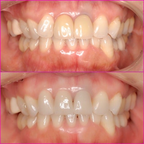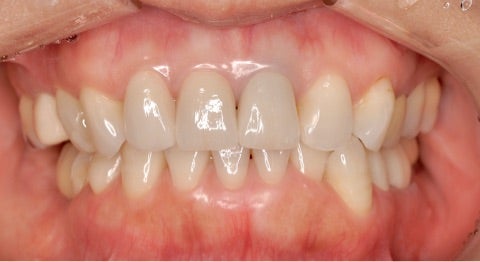 ▶︎明らかに前歯2本の透明感が無く、黄色みが掛かっています。歯茎とのなじみも悪いことがわかります。