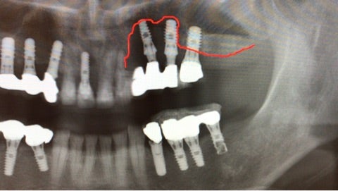 ▶︎赤いラインで引いた部分までインプラントの周りの骨が吸収していることがわかります。