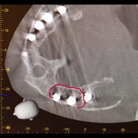 ▶︎CTからもインプラントを取り囲む顎骨の吸収が確認できました。