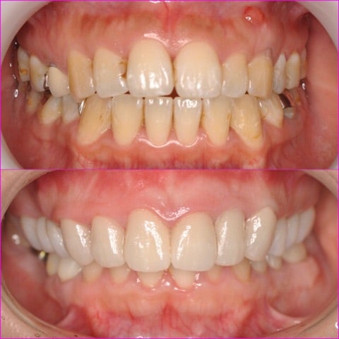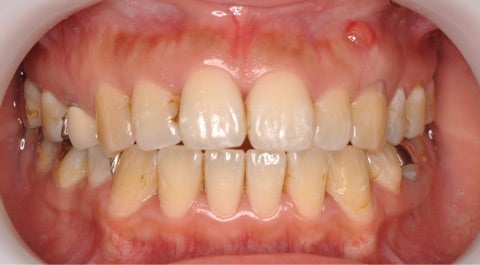 ▶︎全体的に上の前歯の歯列不正と虫歯、不良補綴物(銀歯やクラウン)などが見受けられます。