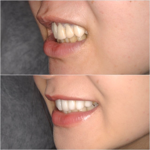 <上:治療前 中:当院での仮歯の状態 下:治療後 側面比較>