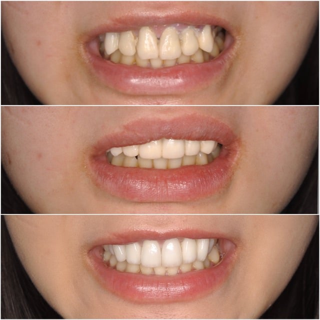 <上:治療前 中:当院での仮歯の状態 下:治療後 正面比較>