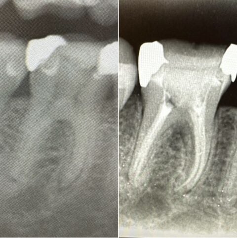 ■4根管で細長く、軽度の湾曲があった為、ニッケルチタンファイルにて根管治療を行い、綺麗な充填が確認できます。